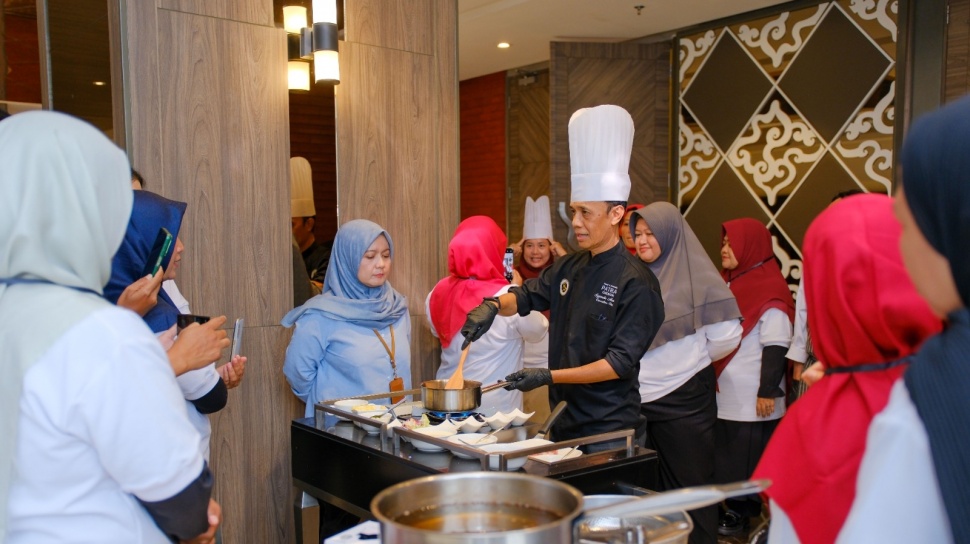 Sebagai bagian dari praktik langsung, peserta juga mengikuti pelatihan dapur (kitchen practice) bersama Chef Pardin dari Patra Cirebon Hotel & Convention, yang memberikan pembekalan mengenai pengolahan makanan higienis, teknik penyajian, dan penerapan prinsip dasar keamanan pangan di dapur produksi.