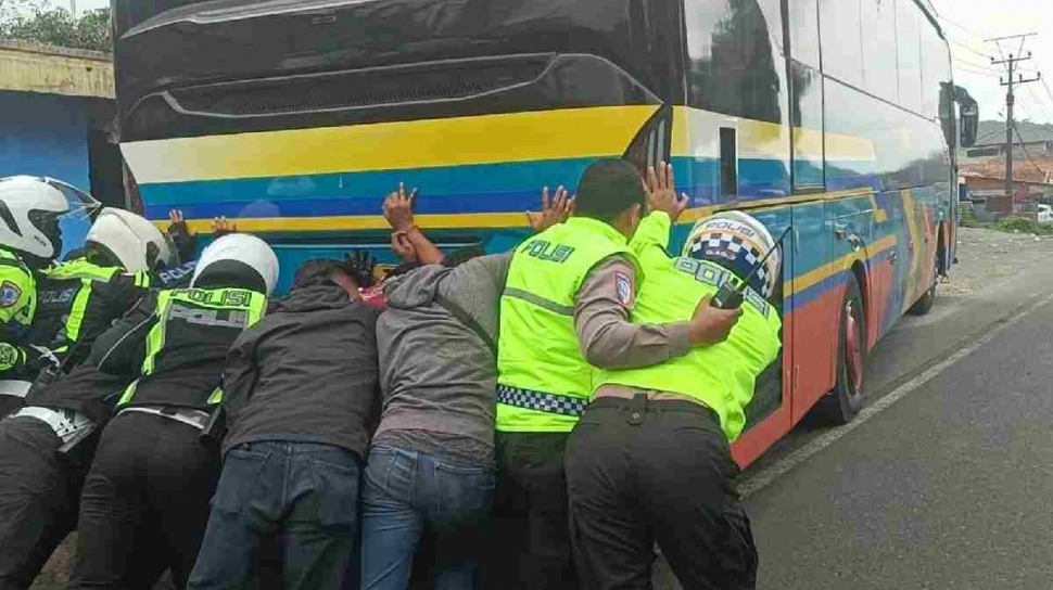 Tak berhenti di situ, dengan seragam yang basah oleh keringat, mereka ikut bahu-membahu menahan dan mendorong bodi mobil agar selamat tiba di bibir tanjakan.